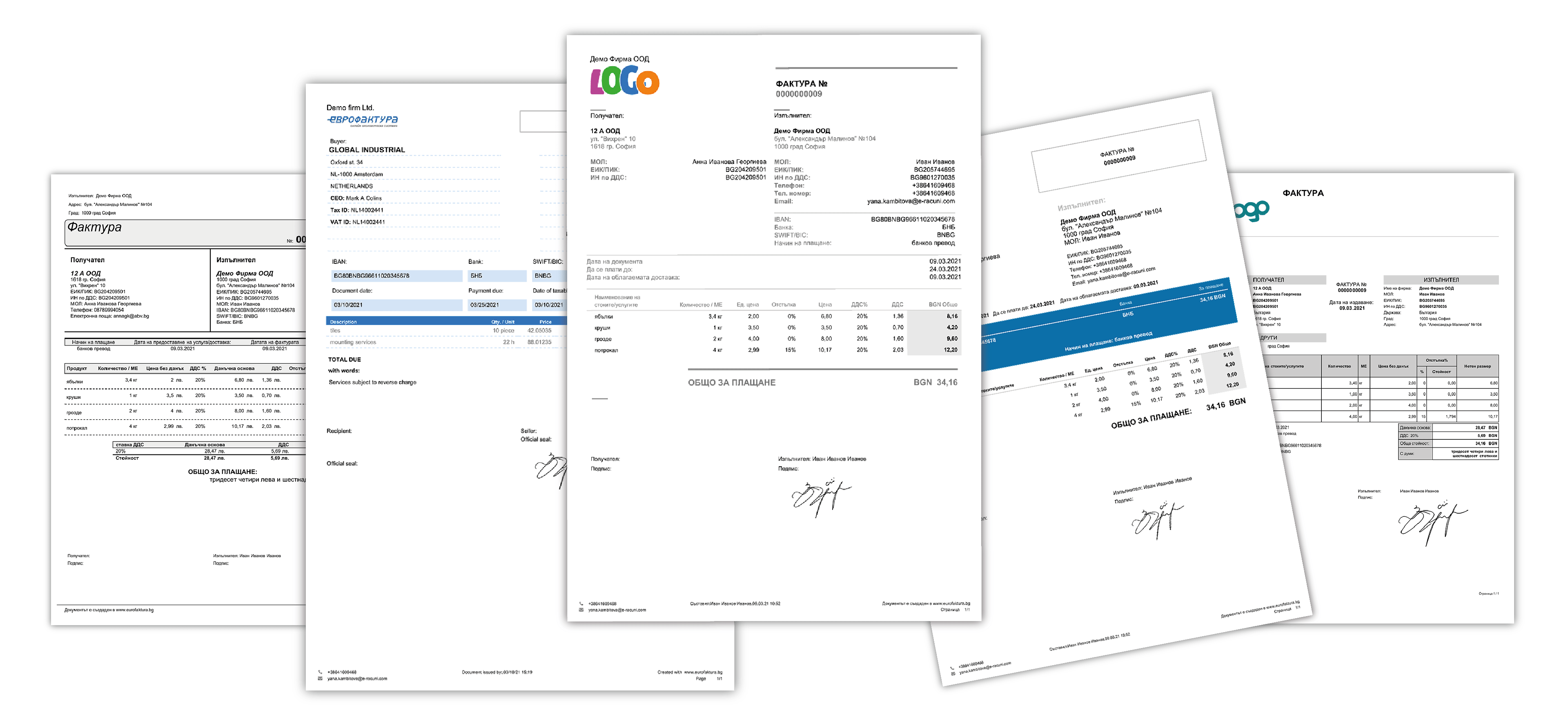 - Многоезикови шаблони за сметки, подготвени на различни езикови версии;